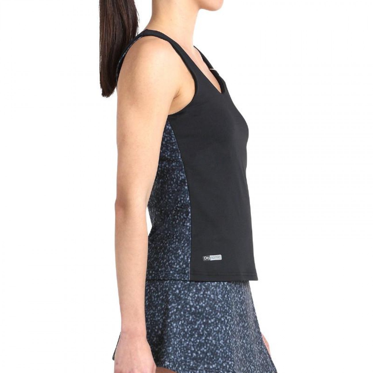 Tank top de jersey elástico, con inserciones asimétricas sublimadas, tirantes y silueta entallada.