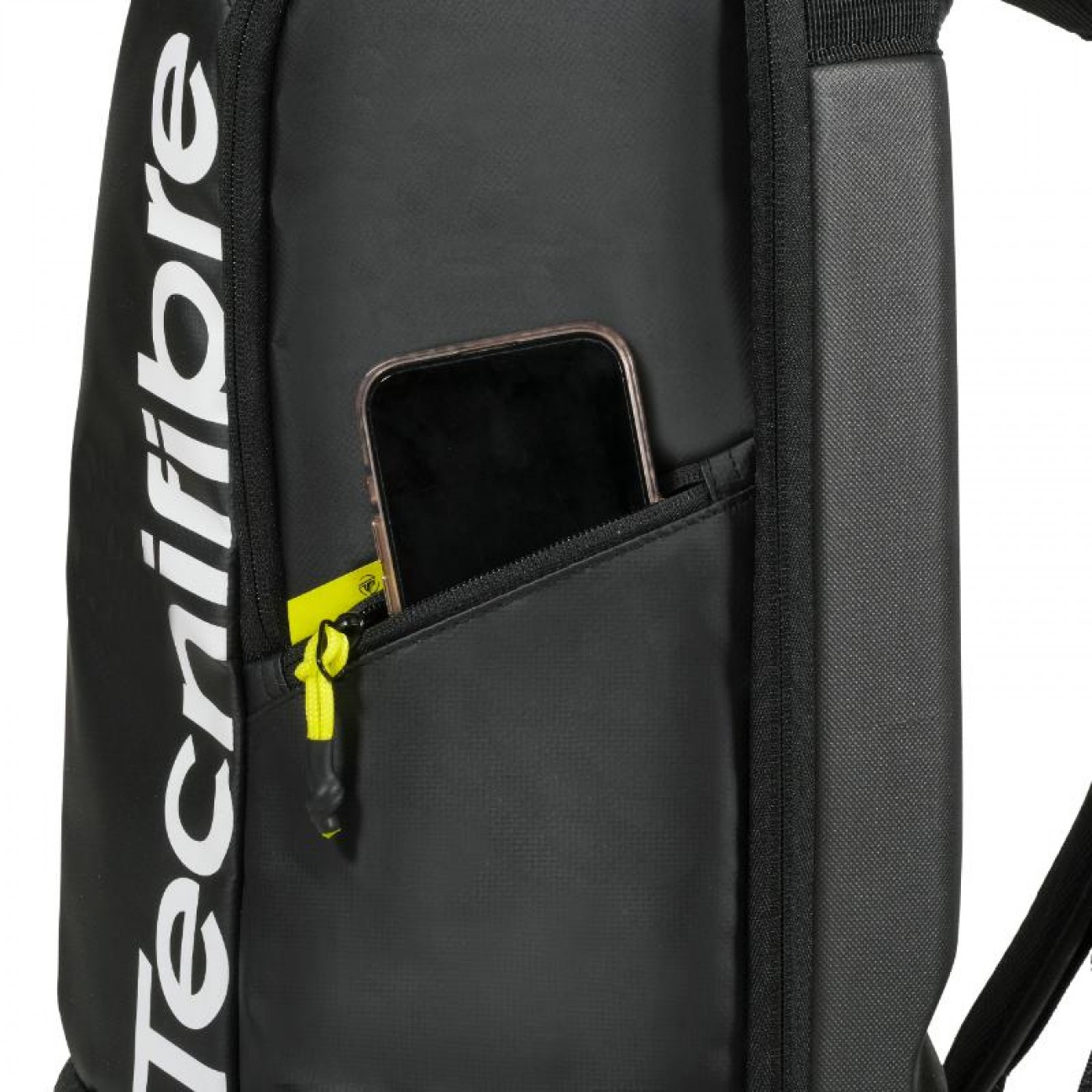 Diseño premium, en tono negro mate con detalles en amarillo intenso, elegante y alineado con la gama de raquetas Tecnifibre.